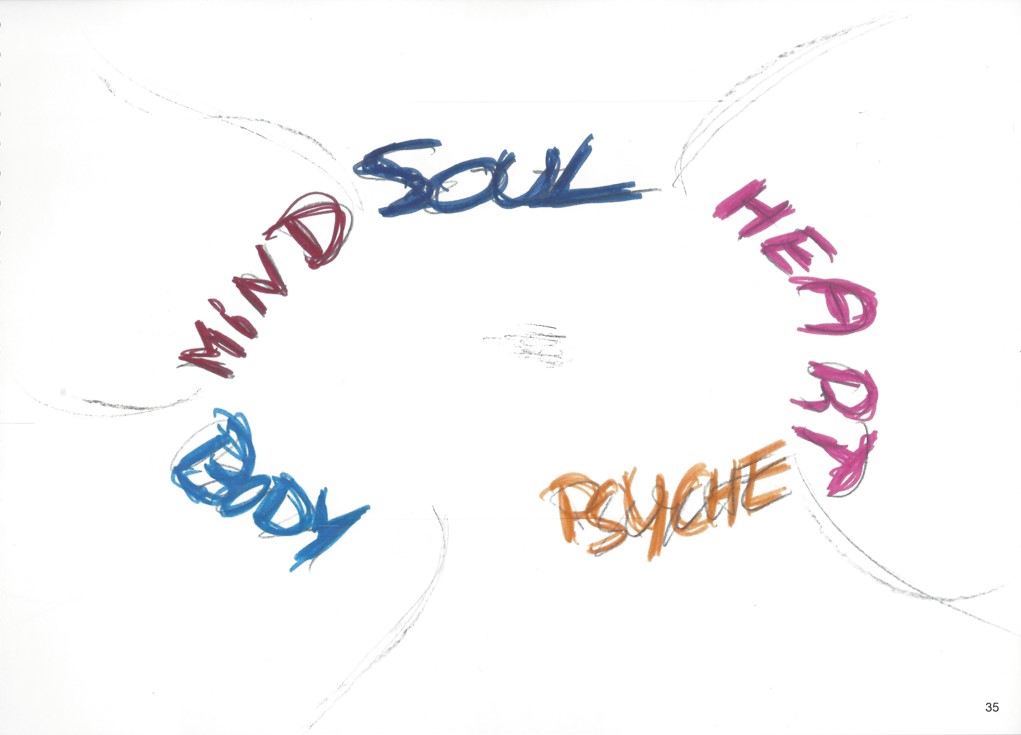 The vegetation on both sides continues its progression towards the outside beyond the word Soul. On the right, dark blue offshoots grow along the line between the Soul and the Heart sections. They intermingle with small pink blades of grass that end before a patch of brown earth bordered by a patch of dark blue. A hairy shape forms at the very top of the drawing, coming out of the dark blue patch, like a primal life form that had not yet decided what it would become. On the left side, towards the Mind, the red grasses touching the letter “D” lead towards a cluster of red bushes evolving along the top left border, interrupted by another brown earth patch near the letter “S” of Soul.